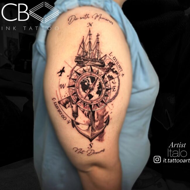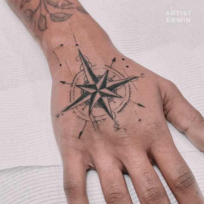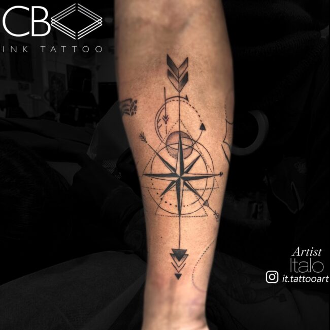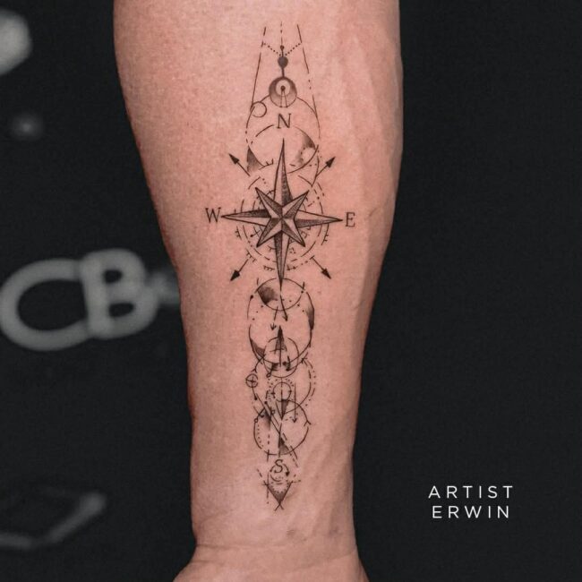 The placement should flow with the natural direction of your muscles. A professional will be able to help you align the arrow of the compass so it doesn’t look crooked when you move. If you choose an otherwise simple design, a bit of dot detailing around the edges can help it “pop” without making it feel cluttered. We want to ensure there’s enough contrast so the design stays legible and makes sense as it ages.